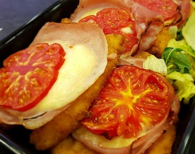 In una casseruola scaldate 1 – 2 cucchiai di olio extravergine di oliva e fatevi dorare lo spicchio d’aglio. Aggiungete la polpa di pomodoro; salate, profumate con un pizzico di origano, coprite e lasciate cuocere a fuoco basso per 7 – 8 minuti, mescolando di tanto in tanto. In un piatto piano, mescolate il pangrattato, il grana e il prezzemolo lavato e tritato. In un piatto fondo, sbattete le uova con 1 pizzico di sale e 1 pizzico di noce moscata. Passate le fette di pollo prima nell’ uovo e poi nel pangrattato, facendo pressione con le mani per fare aderire bene l’impanatura. Friggete le cotolette di pollo in abbondante olio di semi, rigirandole a metà cottura, fino a quando avranno assunto un colore leggermente dorato. A fine cottura appoggiatele su della carta assorbente da cucina per asciugare l’olio in eccesso. Accendete il forno a 200° (ventilato) e foderate la placca del forno con della carta da forno. Tagliate la mozzarella a cubetti. Adagiate le cotolette nella placca del forno e distribuitevi sopra la polpa di pomodoro, poi le fette di prosciutto e, infine, i cubetti di mozzarella. Infornate nel forno già caldo, con la griglia posizionata in alto, fino a quando la mozzarella sarà completamente fusa (occorreranno 7 – 8 minuti). Sfornate le cotolette alla pizzaiola e servitele ben calde.