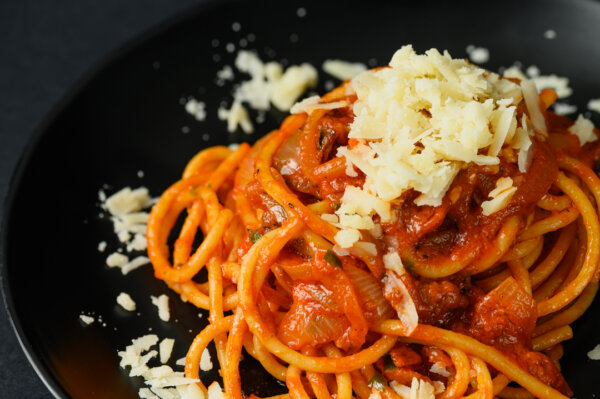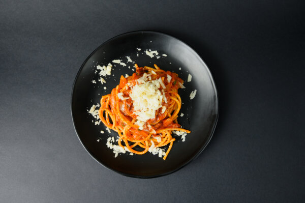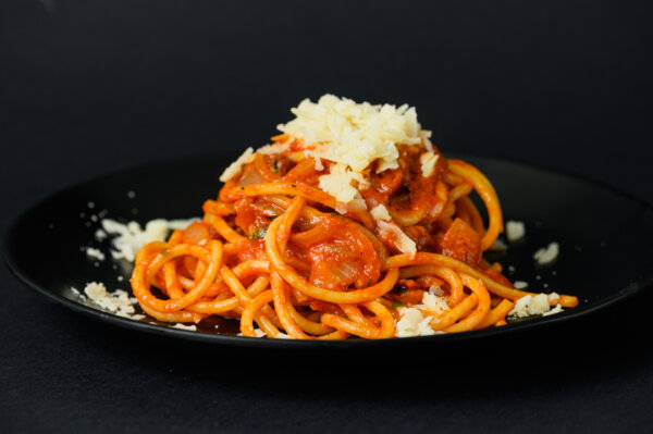 Guanciale, sale, peperoncino, pomodori pelati, pecorino romano, olio extravergine d’oliva.