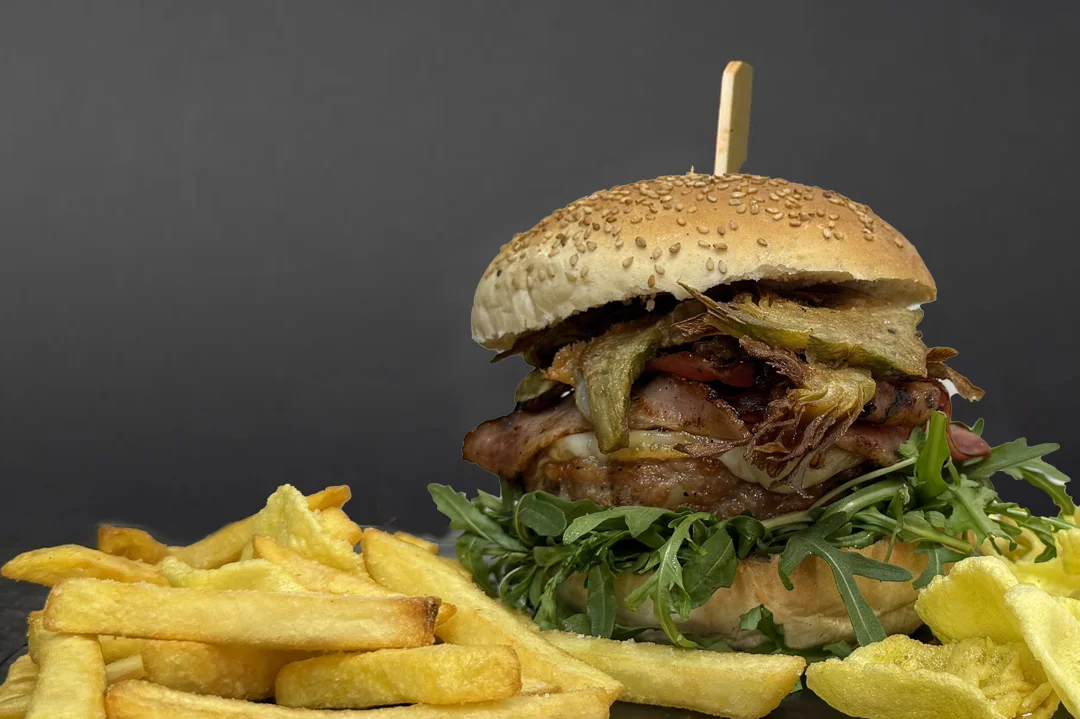 Hamburger di suino nero, rucola, caciotta, bacon croccante e carciofi fritti.