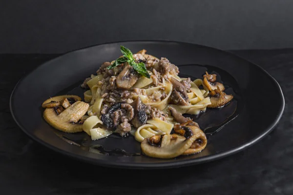 Porzione di fettuccine con funghi e salsiccia di nostra produzione.