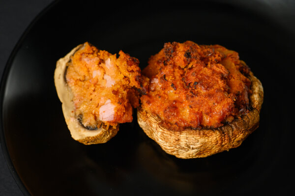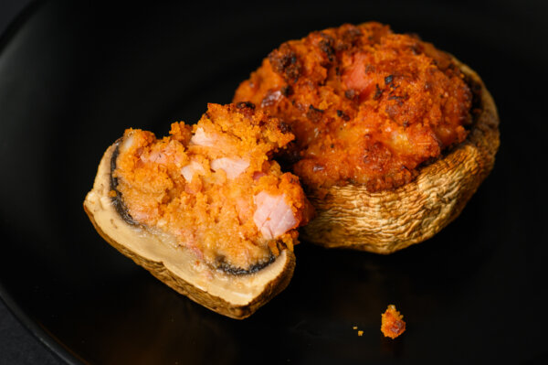 Funghi ripieni con mollica tostata, salumi, formaggio a dadini.