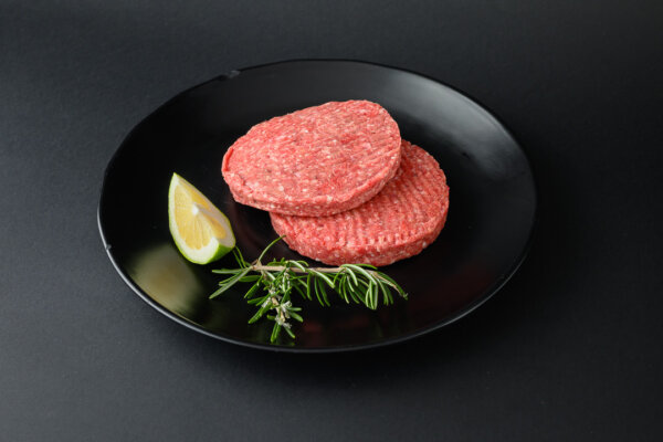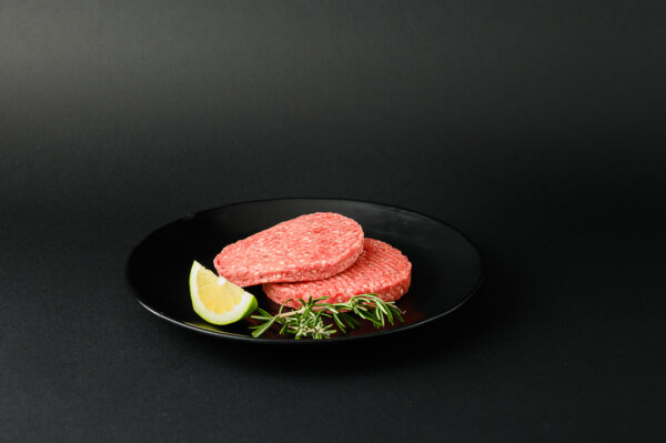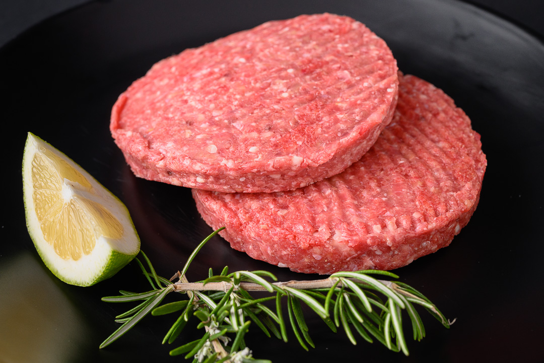 Hamburger di scottona conditi con sale e pepe. Pronti alla cottura.