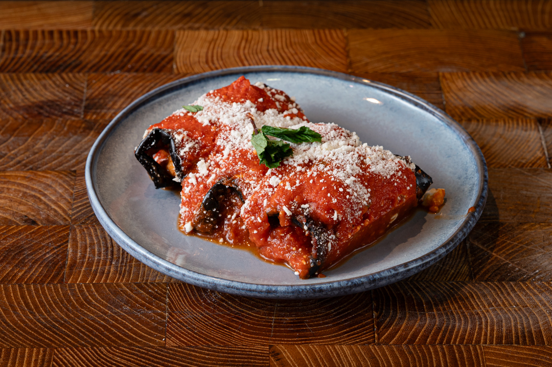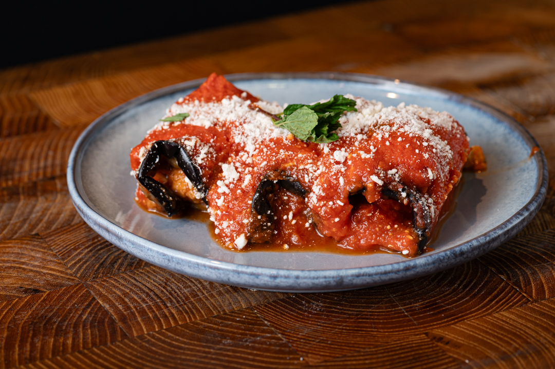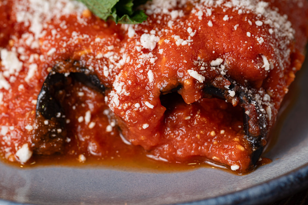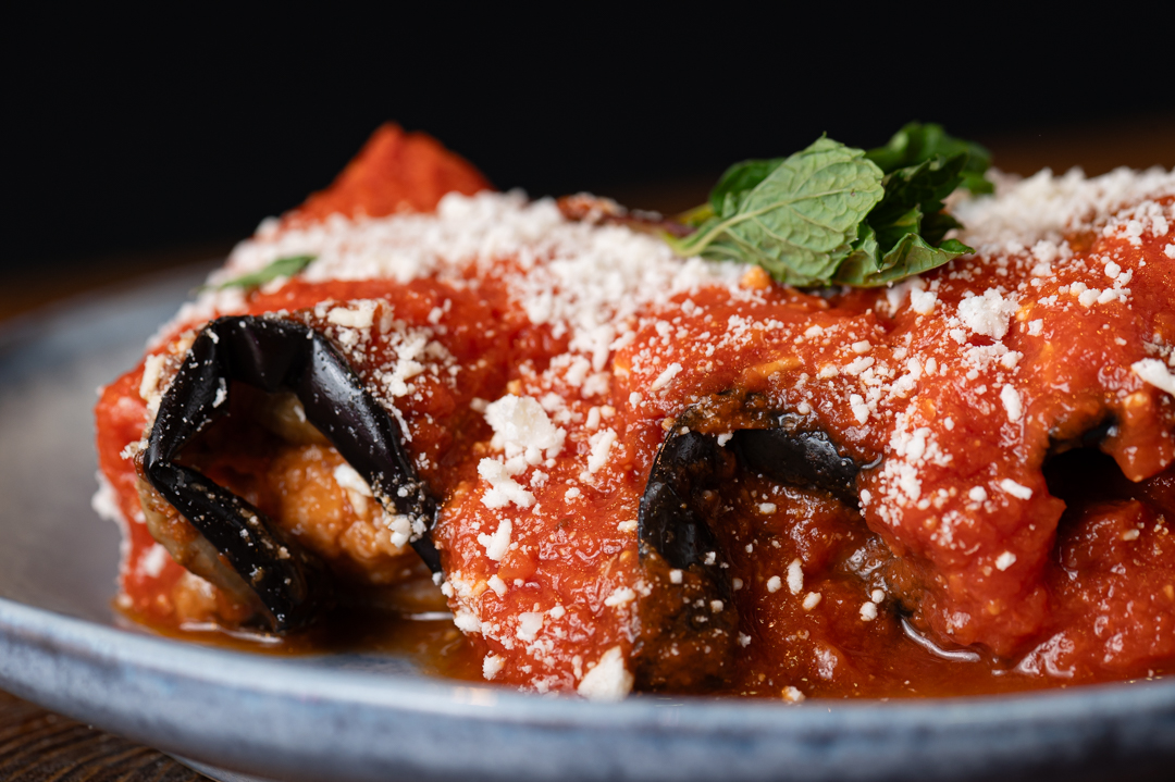 Involtini di melanzane con mollica tostata, prosciutto cotto artigianale e tuma di Castronovo di Sicilia.