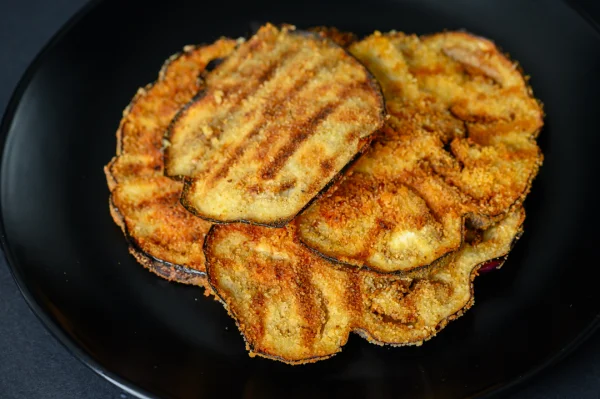 3 fette di melanzane panate con pangrattato e cotte al forno. Semplici, leggere e genuine, perfette come contorno o secondo vegetariano.