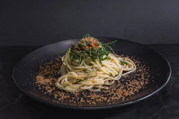 Porzione di spaghetti alla carrettiera con aglio, olio, prezzemolo, mollica tostata.