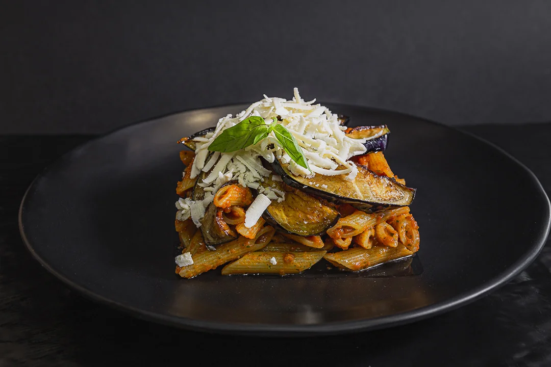 Pennette con sugo fresco, melanzane e ricotta salata grattugiata sopra