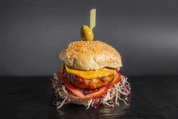Hamburger di pollo, pomodoro, lattuga, cheddar.
