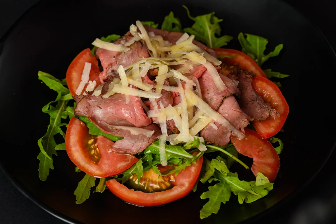 Roastbeef di nostra produzione con rucola, pomodoro e scaglie di grana