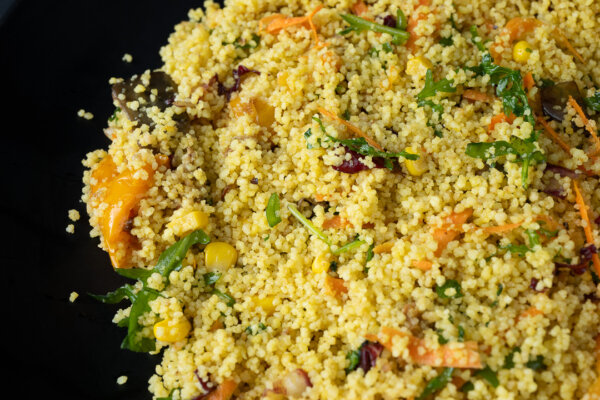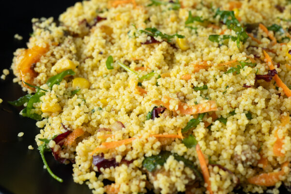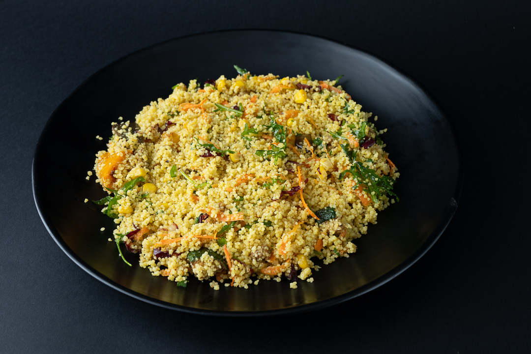 Porzione di tabulè di verdure di 300 gr circa con: tabulè, curry, peperoni, melanzane, zucchinette.