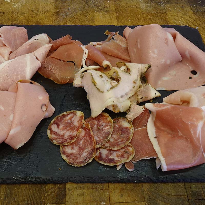 Tagliere di salumi con: mortadella, prosciutto cotto Rovagnati, salame artigianale di nostra produzione, porchetta artigianale di nostra produzione, prosciutto crudo di Parma.