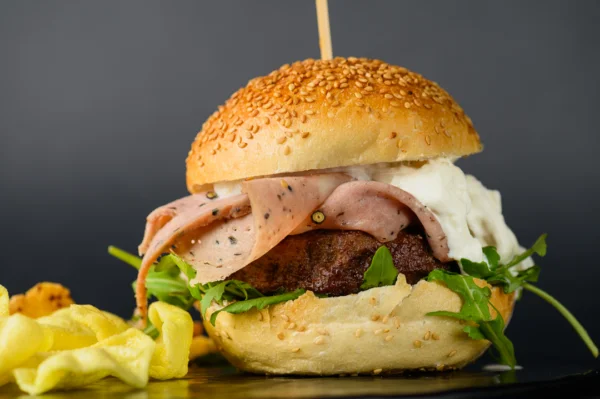 Un hamburger di scottona sale e pepe incontra la mortadella al tartufo, creando un equilibrio tra sapidità e profumo intenso.